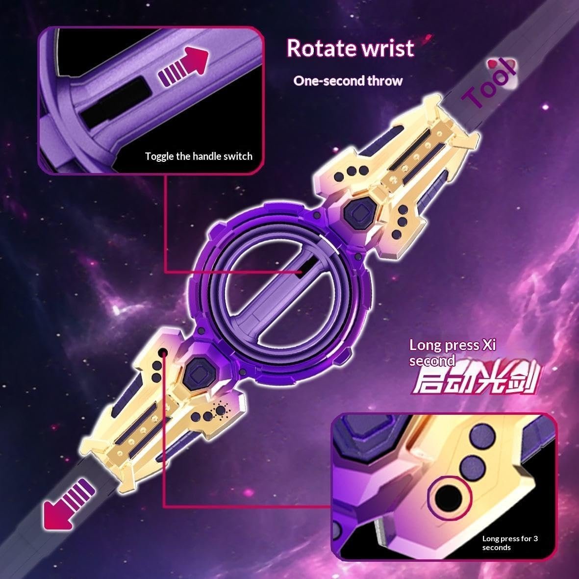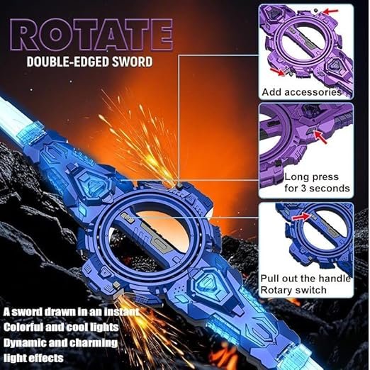 "7-Color LED Light Blade for Dynamic Visuals: Equipped with vibrant RGB lighting that cycles through seven colors, this LED blade adds eye-catching effects to any cosplay or display, bringing your character or roleplay scenes to life with realistic, color-changing illumination. Realistic Smoke and Spark Effects for Dramatic Action: The sword features a built-in vent that produces smoke-like visuals combined with simulated sparks, creating exciting, cinematic effects that enhance roleplay, stage performances, photo shoots, and anime-inspired action sequences. Innovative 360 Dual-Rotational Axis Design: Master flexible fighting styles! The innovative dual-rotational axis supports 360 free rotation, paired with retractable blades. This design allows for a variety of fighting stances and fluid movements, significantly enhancing control fun and enabling dynamic battle sequences."